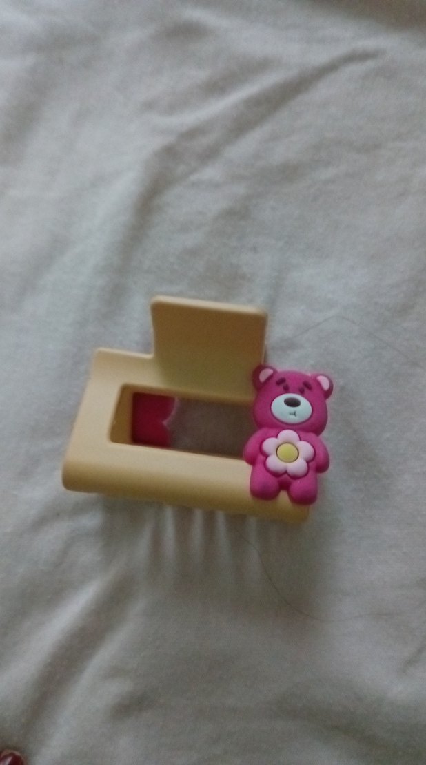 Pastel pembe renkte, ayıcık figürlü ve çiçek detaylı, tokalı çocuk saç tokası. Bohem ve retro tarzda.