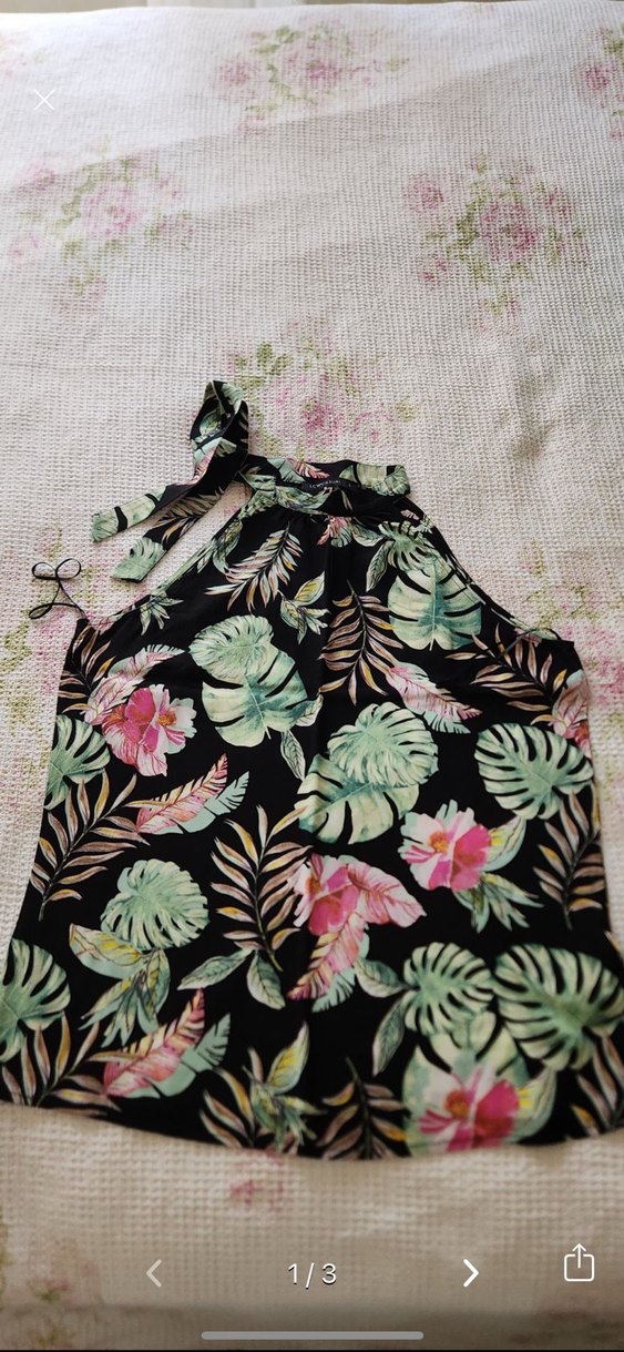 Koyu zemin üzerinde çok renkli çiçek baskılı bluz. Ayarlanabilir bağlama ipleri ve rahat dokusu ile konfor sağlar.