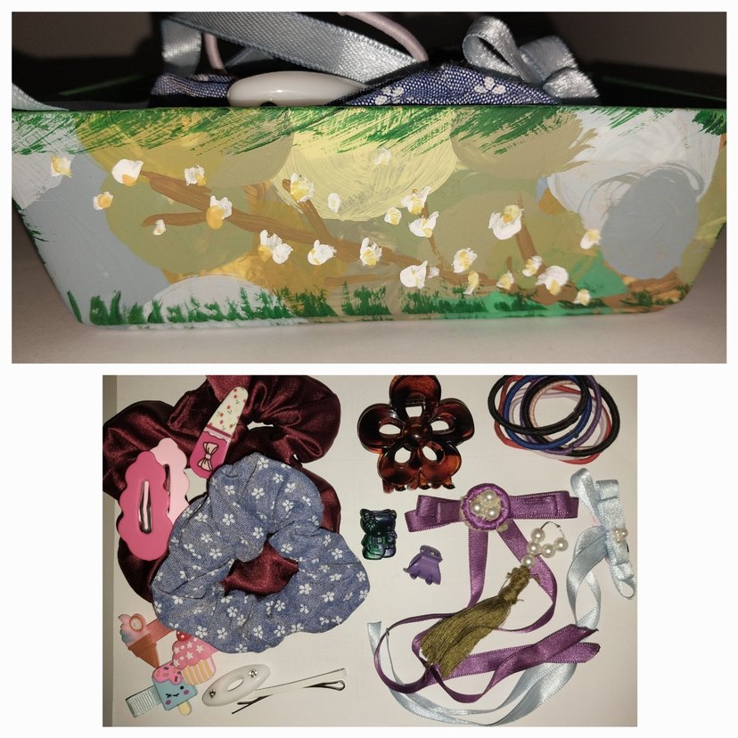 Çiçekli baskılı desenli, pastel renkli fiyonk detaylı çok renkli çocuk saç tokası ve bant seti.Özel boya tasarımlı seramik düzenleyici.