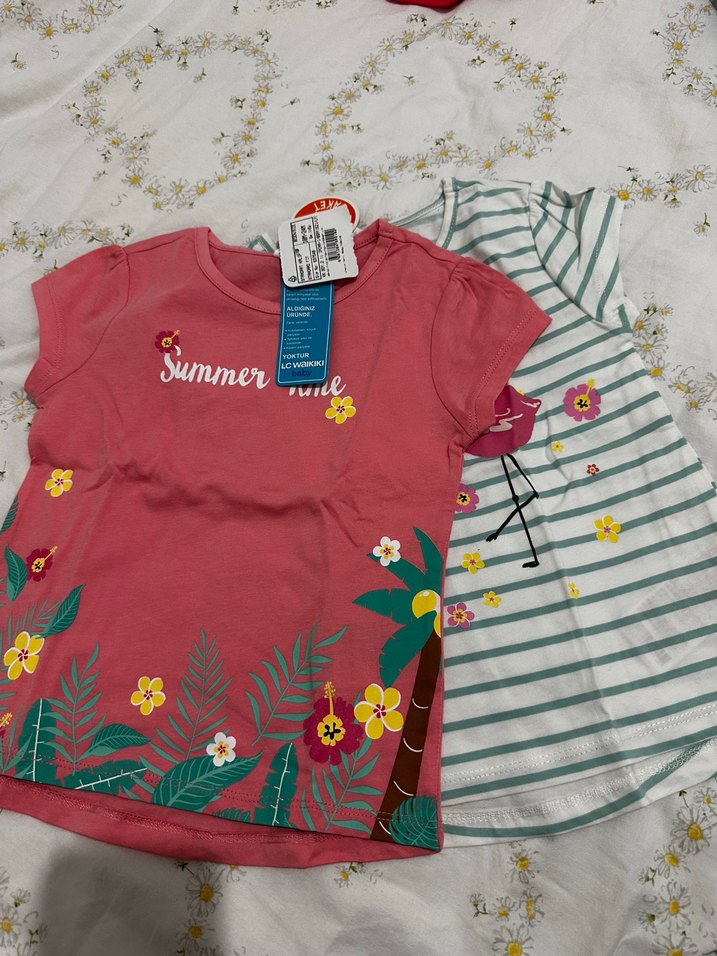 Pembe renkli, kısa kollu, straplez yaka ve çiçek baskılı kız çocuk tişörtü, yaz temalı baskısı ile dikkat çekiyor.