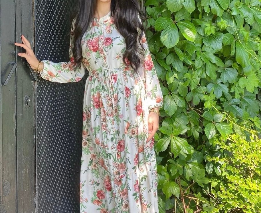 Çiçek desenli, beyaz uzun elbise bol kesim, tekne yaka ve uzun kolludur. Yumuşak sentetik kumaştan, drapeli tasarıma sahiptir, günlük kullanıma uygundur. S beden ama belli bağlamalı olduğu için daha zayıfa da daha kiloluya da olur. siz ayarlıyorsunuz