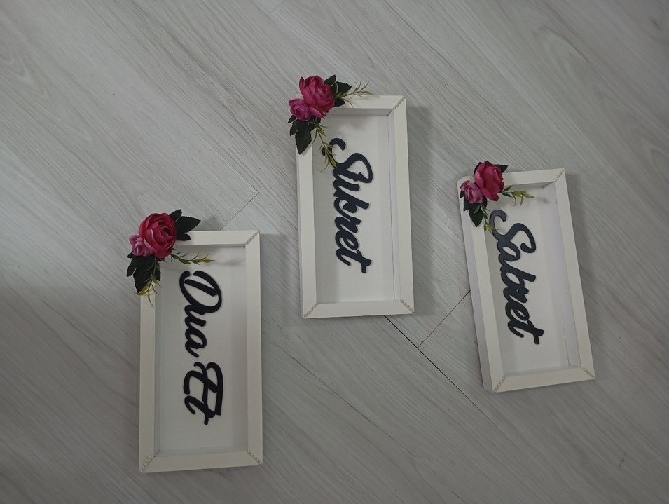 Beyaz çerçeveler, siyah yazı ve pembe çiçek detaylarıyla süslenmiştir. Her çerçevede farklı bir kelime yer alır.