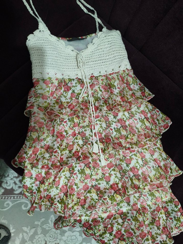 Askılı, straplez örgü üst ve pembe çiçek desenli, fırfırlı etekli, bol kesim göğüs kısmı tam oturuyor bohem tarzda.