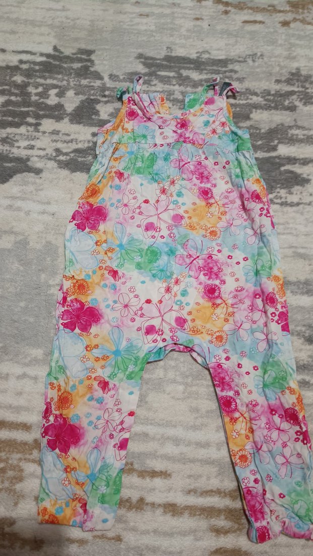Pastel renklerde, çiçekli desenli ve dantelli, bol kesim kız çocuk kolsuz tulum. Yumuşak sentetik kumaştan üretilmiştir.