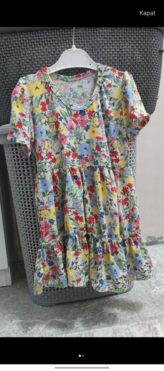 Renkli, kısa kollu, V yakalı kız elbisesi. Çiçekli tie-dye desenli, bol kesim ve fırfır detaylı Bohem tarzda.