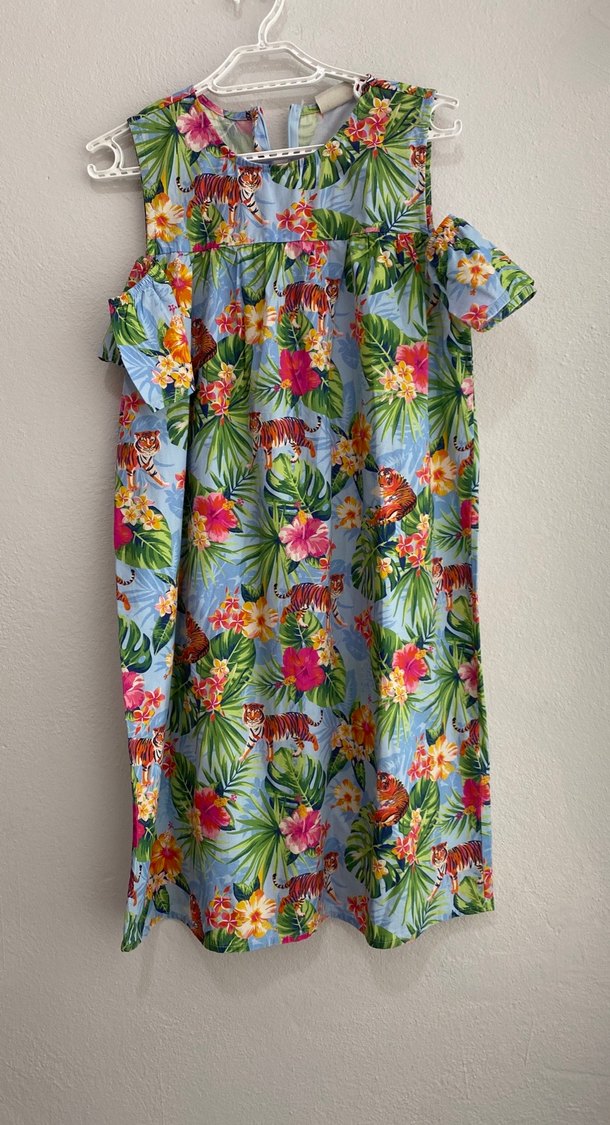 Renkli kız elbisesi, bol kesim, kısa fırfırlı kollu ve straplez yakalıdır. Yumuşak sentetik kumaştan yapılmıştır, tropikal çiçek ve kaplan desenleriyle bohem tarzını yansıtır.