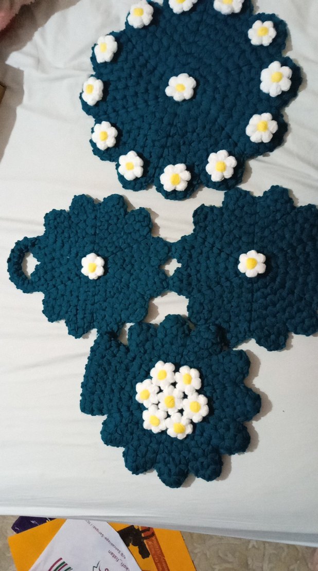 Derin yeşil zemin üzerinde beyaz ve sarı çiçek detaylı yuvarlak bohem tarzda örgü dekoratif lif