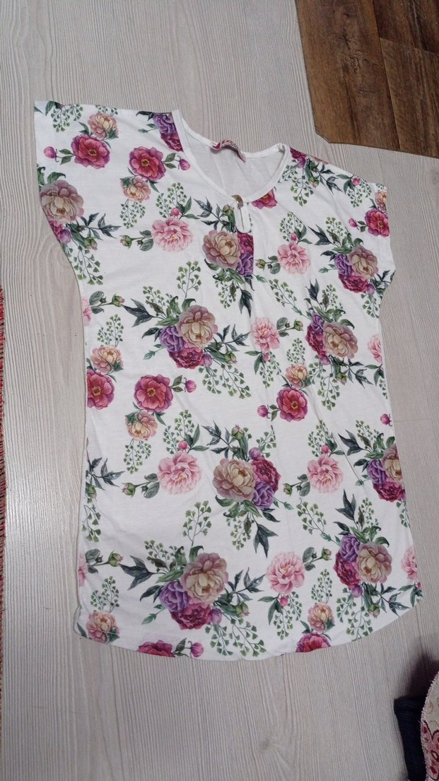 Bu bol kesim tişört pastel çiçek desenli, kısa kollu ve yuvarlak yakalıdır. Düğme detayları ve bohem tarzı vardır.