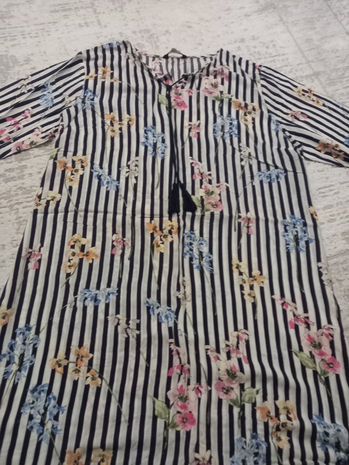 fırfırlı tekne yaka, uzun kollu ve bol kesimdir. Gri ve beyaz çizgili, çiçek desenli sentetik kumaştandır.