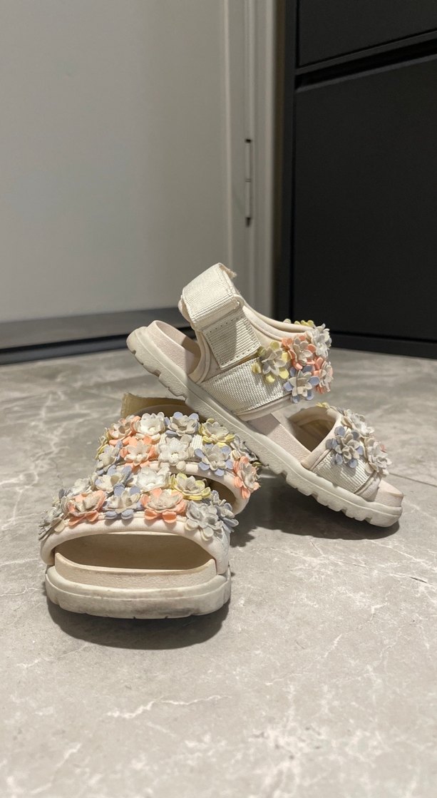 Krem kız sandaleti, küçük bir kusuru var kullanmaya engel değil , çiçekli boncuk süslemeli, kauçuk malzemeden, sokak modasına uygun şık tasarım.