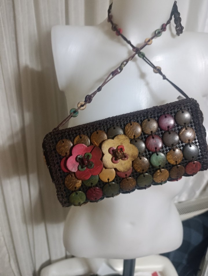 Çiçek desenli, boncuklarla süslenmiş örgü bohem çanta, günlük kullanım için uygun, iki büyük çiçek detaylı.