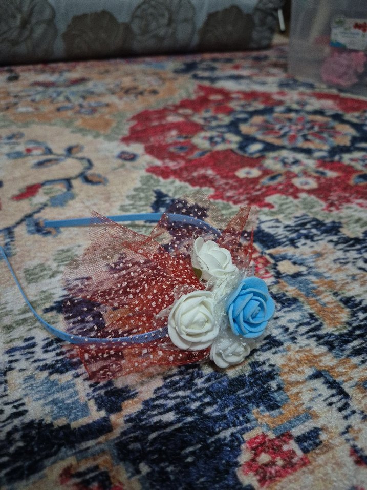 Bohem tarzda, renkli boncuklar ve çiçek detaylarıyla süslenmiş, beyaz ve mavi çiçekli, ince tül detaylı çocuk saç bandı.