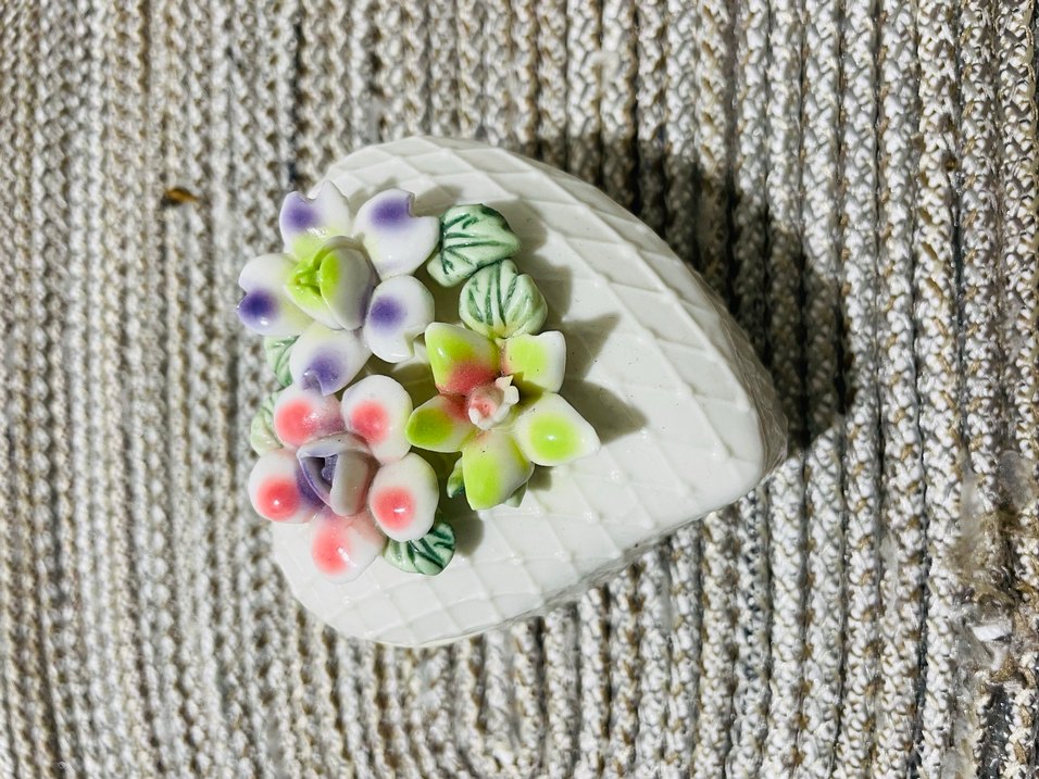 Beyaz kalp şeklinde, pastel renkli boncuklu çiçeklerle süslenmiş vintage ve bohem tarzda takı kutusu