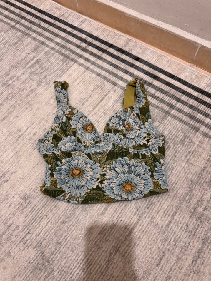 Mavi ve gri tonlarında çiçek desenli, askısız ve düğmeli kısa, vücuda oturan mini büstiyer. Bohem ve vintage tarz için uygun.