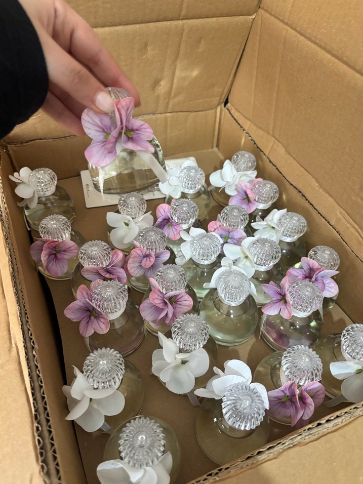 Cam parfüm şişeleri, üzerlerinde pembe ve beyaz çiçek süslemeleri ve dokulu yuvarlak tıpa ile. Hediye veya dekor için uygun. 50 adet mevcut makas hediye❤️