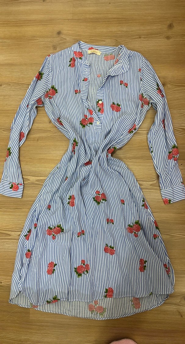 Renkli bohem tarzda, uzun kollu, V yaka ve düğmeli pamuklu elbise vs tunik . Çizgili ve çiçek desenli, bol kesim, günlük kullanıma uygun.