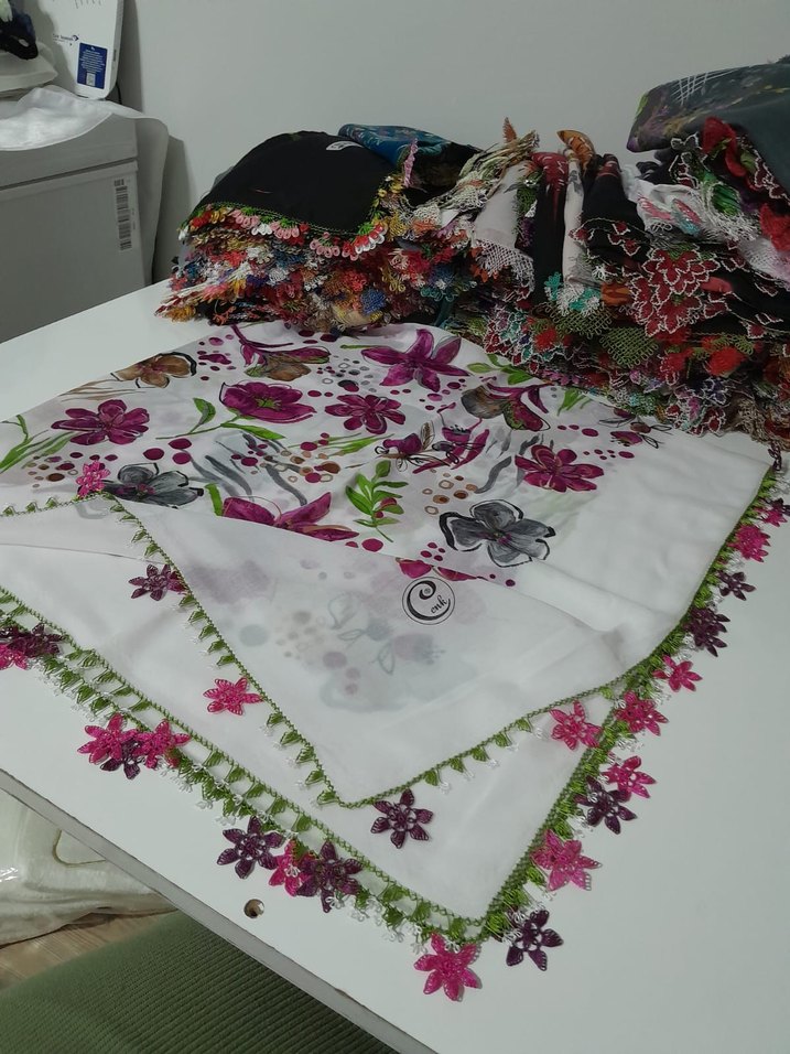 Kadınlar için çok renkli çiçek desenli tekstil fular, dantel detaylarıyla bohem tarzı yansıtıyor. Canlı renkler ve ince dantel işçiliği içerir.