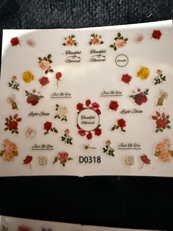Hafif ve canlı çok renkli çiçek desenli tırnak süsleri, küçük yazı detaylarıyla D0318 kodlu.