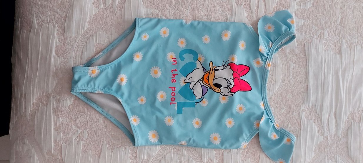 Pastel mavi kısa kollu kız mayosu, papatya desenleri ve Daisy Duck baskısıyla plajda ve günlük kullanımda uygundur.