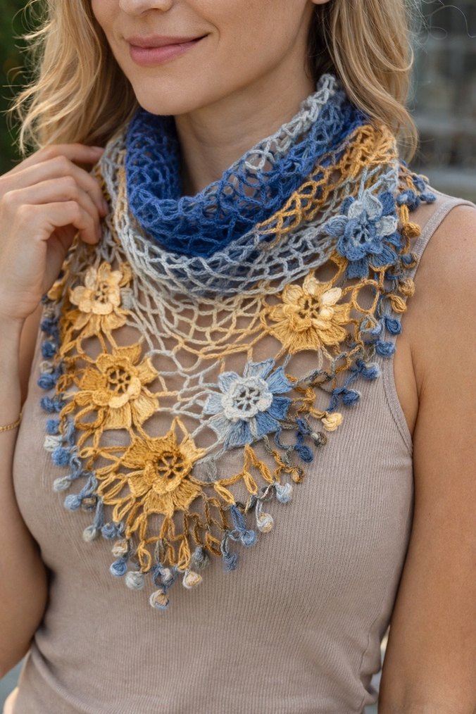 Çiçek desenli dantel detaylı, mavi, gri ve sarı tonlarında çok renkli, bohem tarzda örgü şal. Retro ve hippie tarzına uygun.