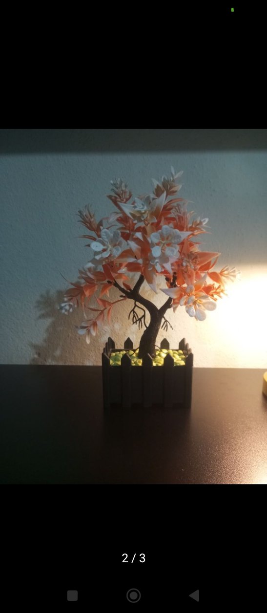 koyu renkli çitli saksıda turuncu ve beyaz çiçekli dekoratif ağaç.