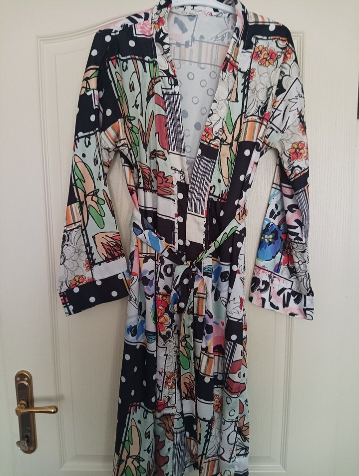 Renkli desenli tekstilden yapılmış, düğmeli ve bol kesim uzun kadın kimonosu. Uzun kollu ve V yakalı, bohem ve retro tarzları birleştirir. Günlük kullanıma uygun.
