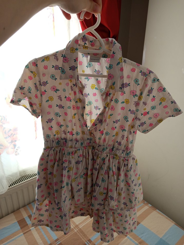 Düğmeli, kısa kollu, yakalı, bol kesim kız elbisesi. Pastel tonlarda çiçekli baskıya sahip yumuşak dokulu kumaştan yapılmıştır. 4/5 yaş