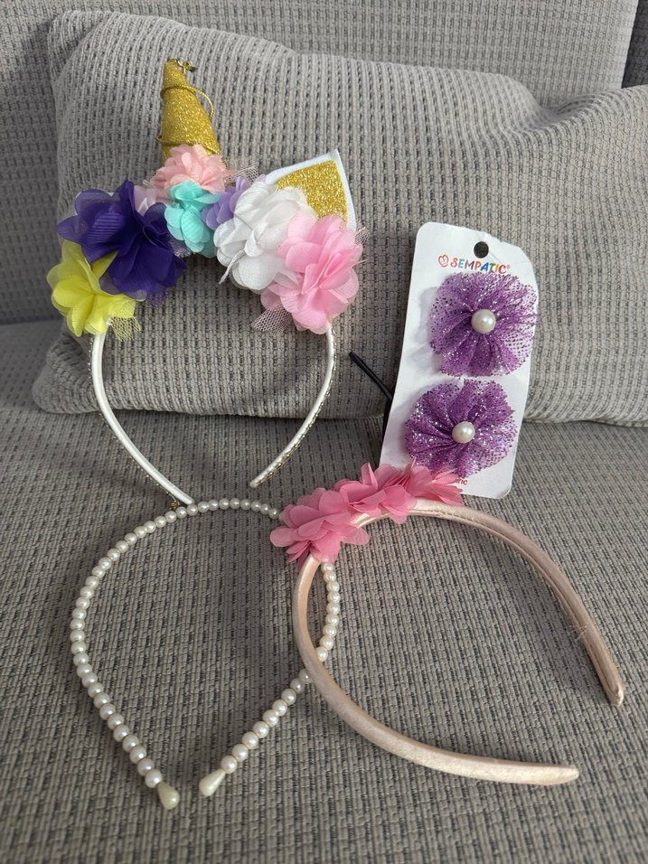 Çiçek desenli, elastik ve inci detaylı renkli çocuk saç bantları ve tokalar, bohem tarzına uygun.