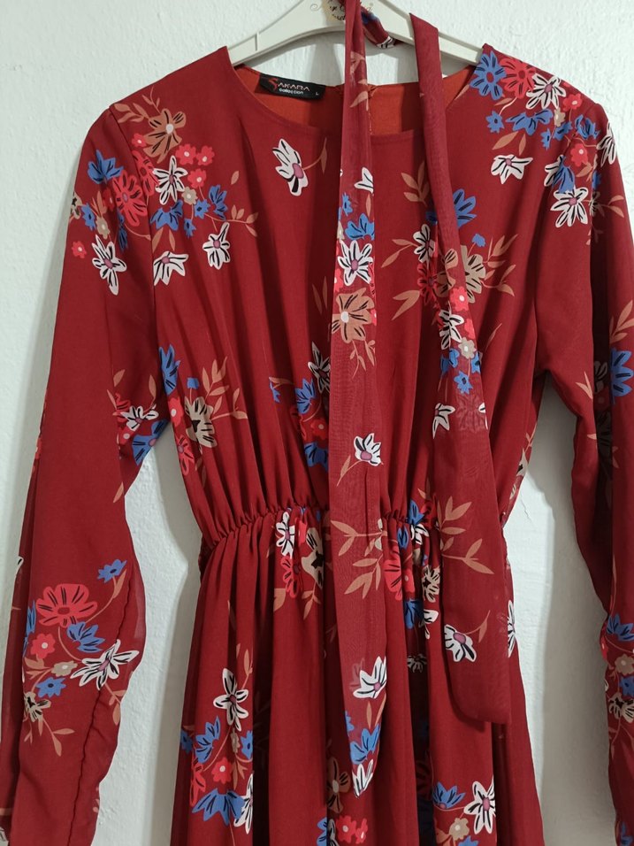 Diger markasının bordo uzun elbisesi, çiçek desenli, bol kesim, drapeli tasarım ve askılı kollar ile yüksek yakaya sahiptir. marka : diğer