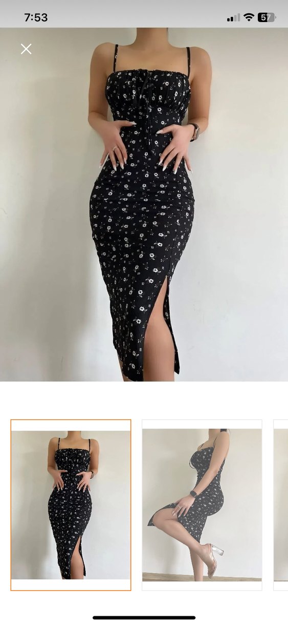 Çiçekli askılı yırtmaçlı uzun elbise