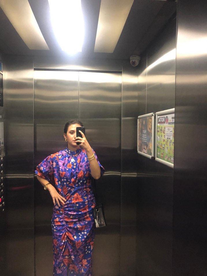 2-3 kez giydim. Renkli bağlama desenli elbise, yüksek yakalı ve balon kollu. Rahat günlük, nişanlık, yazlık bir elbise. Önden yırtmacı var.