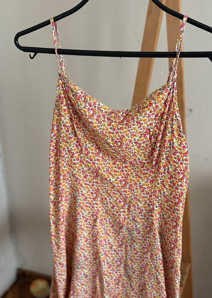 Askılı çiçekli mini elbise. Sırt kısmı lastikli o yüzden rahat bir model. Askıları uzayıp kısalabiliyor.
