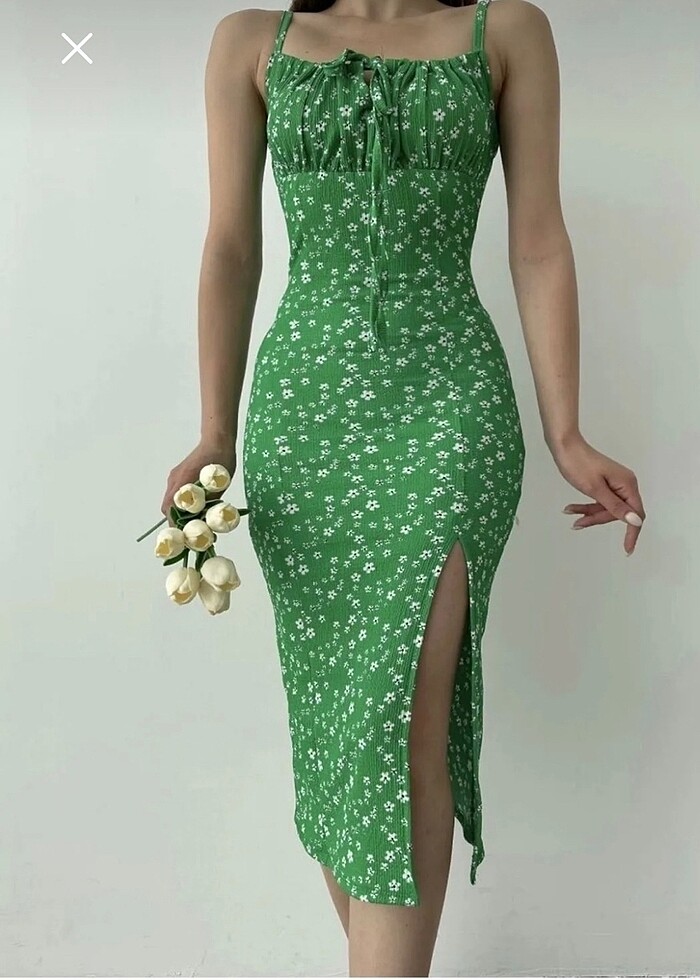 yeşil ip askılı diz boyu göğüs kısmı ayarlanabilir diz kısmı yırtmaçlı l beden esnek kumaş ihtiyaç fazlası