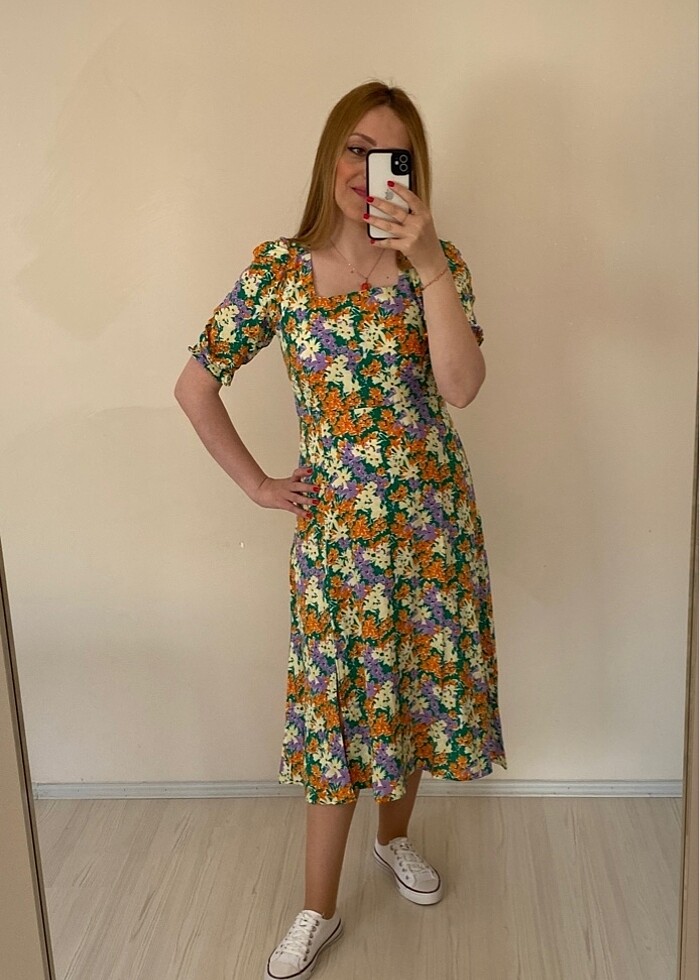 Kare yaka çiçekli elbise, bel oturtmalı S beden