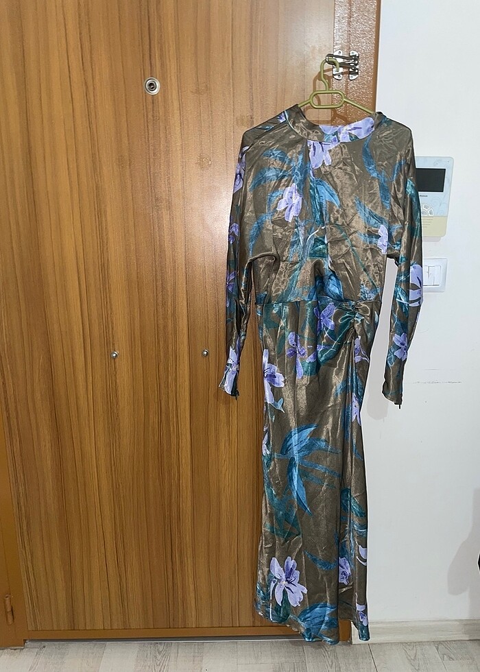 Çiçekli elbise önünde güzel bir bağlama detayı var yeni hiç daha önce giyilmedi satene yakın