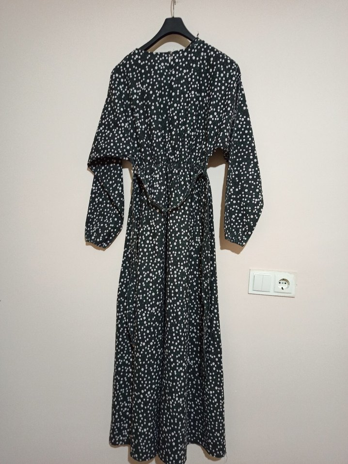 , bağlamalı ve dökümlü tasarıma sahip uzun elbise. Uzun kollu elbise marka temsilidir