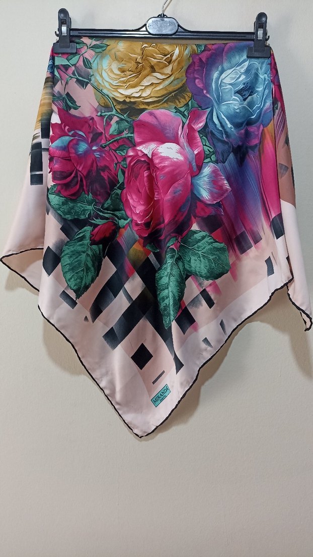 Kadınlar için ipek dokulu, çiçek desenli ve pastel çok renkli, drapeli tasarıma sahip modern Paris tarzı eşarp ucunda biraz çekme var fotoğrafta belirttim