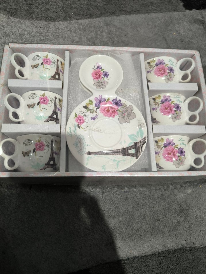 Çiçek ve Eyfel Kulesi desenli beyaz kahve fincan seti, fincanlar ve uyumlu tabaklardan oluşur. Hafif renkler zarif bir görünüm sağlar. ☕6lidir glass in love marka.kizlarimin ceyizlikleri satıp başka ihtiyaclarini alicam sayfamda çok fazla fincan takımı var bakın lütfen