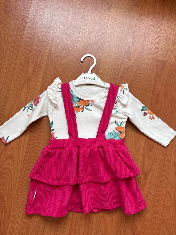 Uzun kollu, omuzları fırfırlı çiçek desenli kız çocuk elbisesi. İçi zıbın, pembe askılı kat kat eteği ile çok şık. Çok şık yumuşacık pamuklu kumaş. 12-18 ay hiç kullanılmadı. Etiketini yok sıfır ürün