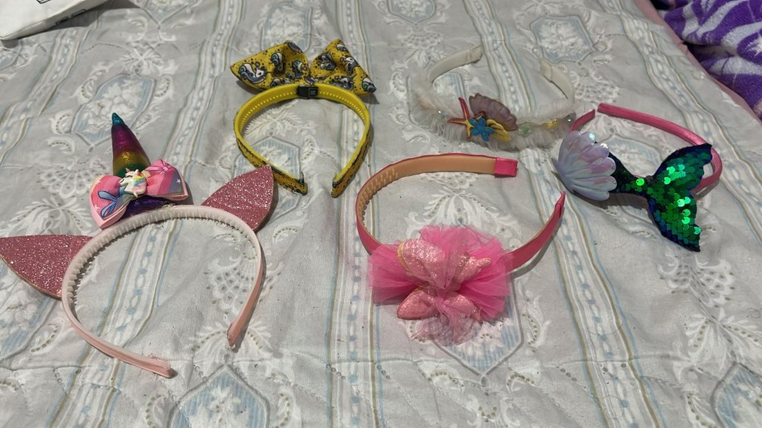 Pembe ve sarı renklerde, çiçek desenli ve fiyonklu renkli çocuk saç bantları. 5adet 20ü tl