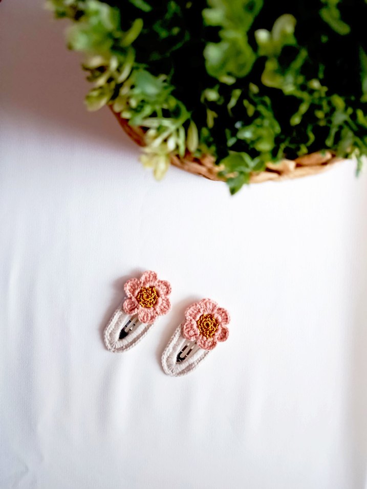 Pastel pembe renkte, dantel ve çiçek detaylı, bohem tarzda çocuk saç tokası seti.