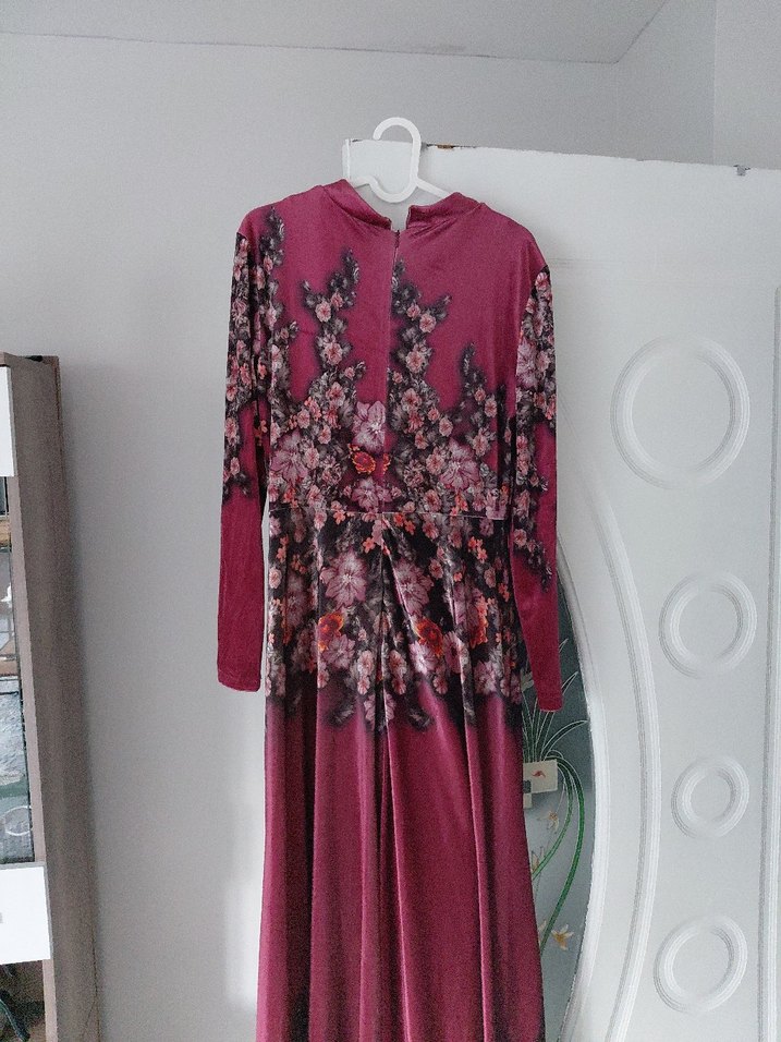 Uzun kollu, yüksek yakalı, pembe tabanlı ve çiçek desenli, sentetik kumaşlı, drapeli ve fit kesim uzun elbise. Düğünler için uygundur.