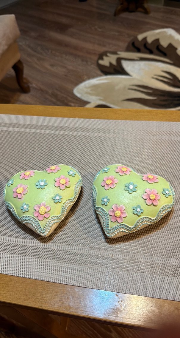 Pastel yeşil zemin üzerine pembe ve mavi çiçek detaylı kalp şeklinde dekoratif objeler. Mekanınıza yumuşak ve şirin bir dokunuş katar.