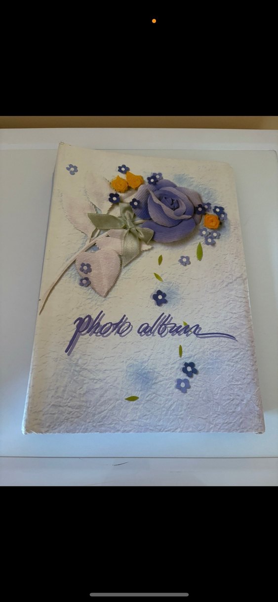 Beyaz dokulu kapakta mor gül, küçük çiçekler ve yeşil kurdele fiyonk bulunan fotoğraf albümü. Kapakta 'photo album' yazısı yer alır. 50 sayfa 600 fotoğraflık