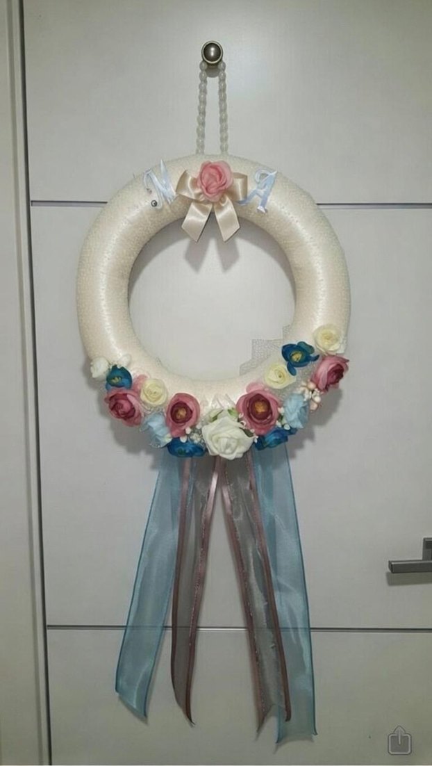 Fiyat sorunuz.Pastel renklerde kumaş çiçekler ve kurdelelerle süslenmiş beyaz kapı süsü. Romantik detaylara sahip Kişiye özel istediği renklerde tasarlanir
