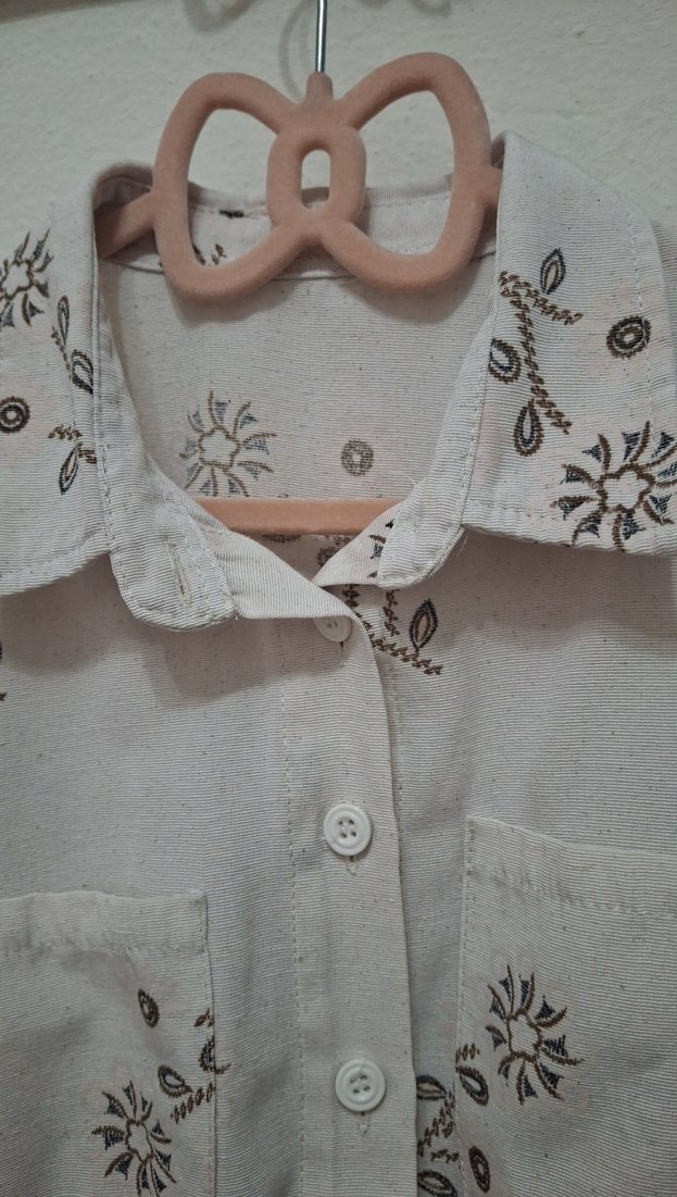 Bej keten kumaştan, yakalı ve düğmeli uzun kollu gömlek. Nakışlı vintage desenlerle bohem tarzda, rahat kesim. Günlük kullanıma uygun. 10 11 12 yaşa uygun