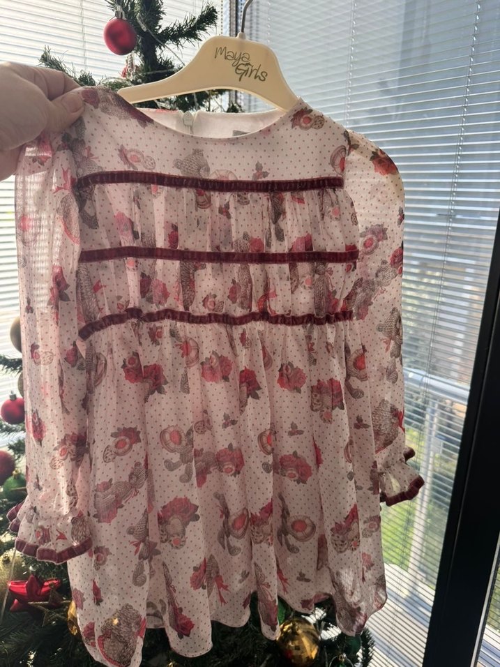 Açık pembe bohem tarzda kız çocuk elbisesi, uzun kollu ve fırfırlı detaylara sahip. Baskılı desenli, rahat kesim ve yuvarlak yakalıdır. Astarı pamuk.çok iyi durumda.3-4 yaş