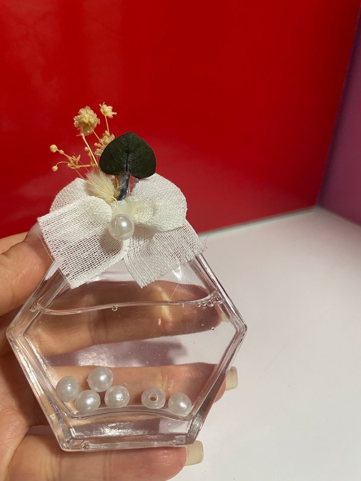 Şeffaf altıgen cam şişede, beyaz kumaş fiyonk, küçük kurutulmuş çiçekler ve içinde inci boncuklar bulunan 20 adet kolanya şişesi. Kişiye özel isim etiketleri mevcuttur