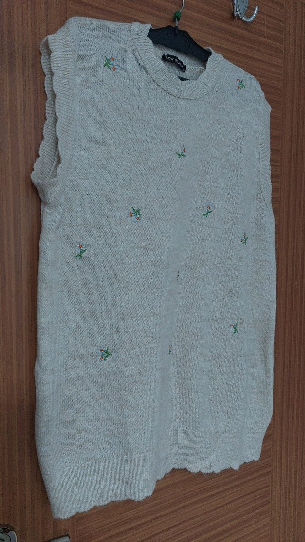 Yuvarlak yaka, nakışlı çiçek detaylı, triko kumaştan örülmüş, salaş kesim ve midi boyda, krem renkli kadın süveter. xl