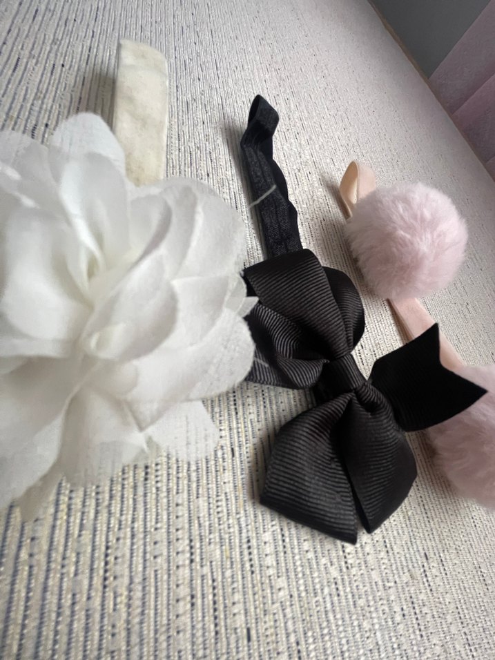 Beyaz ve siyah çiçek desenli, kurdele detaylı çocuk saç bantları. Yumuşak dokulu, gotik tarzda tasarlanmıştır.